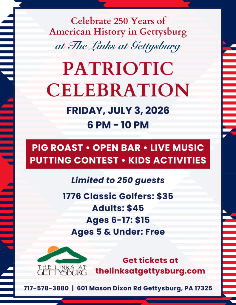 Patriotic CelebrationBy Sabrina Luta / July 3, 2026 Date/Time: 07/03/2026 | 6:00 pm - 10:00 pm Location: The Links At Gettysburg Additional Info Patriotic Celebration 1776 Classic Golfer Ticket to the Patriotic Celebration Quantity Price: $35.00 Quantity Names of Ticket Holders That Played in the 1776 Classic Separate multiples by comma Adult Tickets Quantity Price: $45.00 Quantity Names of Adult (non golfer) Ticket Holders Separate multiples by comma Tickets for Ages 6-17 Quantity Price: $15.00 Quantity Names of Ages 6-17 Ticket Holders Separate multiples by comma Tickets for Ages 5 & Under Quantity Price: $0.00 Quantity Names of 5 & Under Ticket Holders Separate multiples by comma Total CAPTCHA Share via: Facebook Twitter Email Print More
